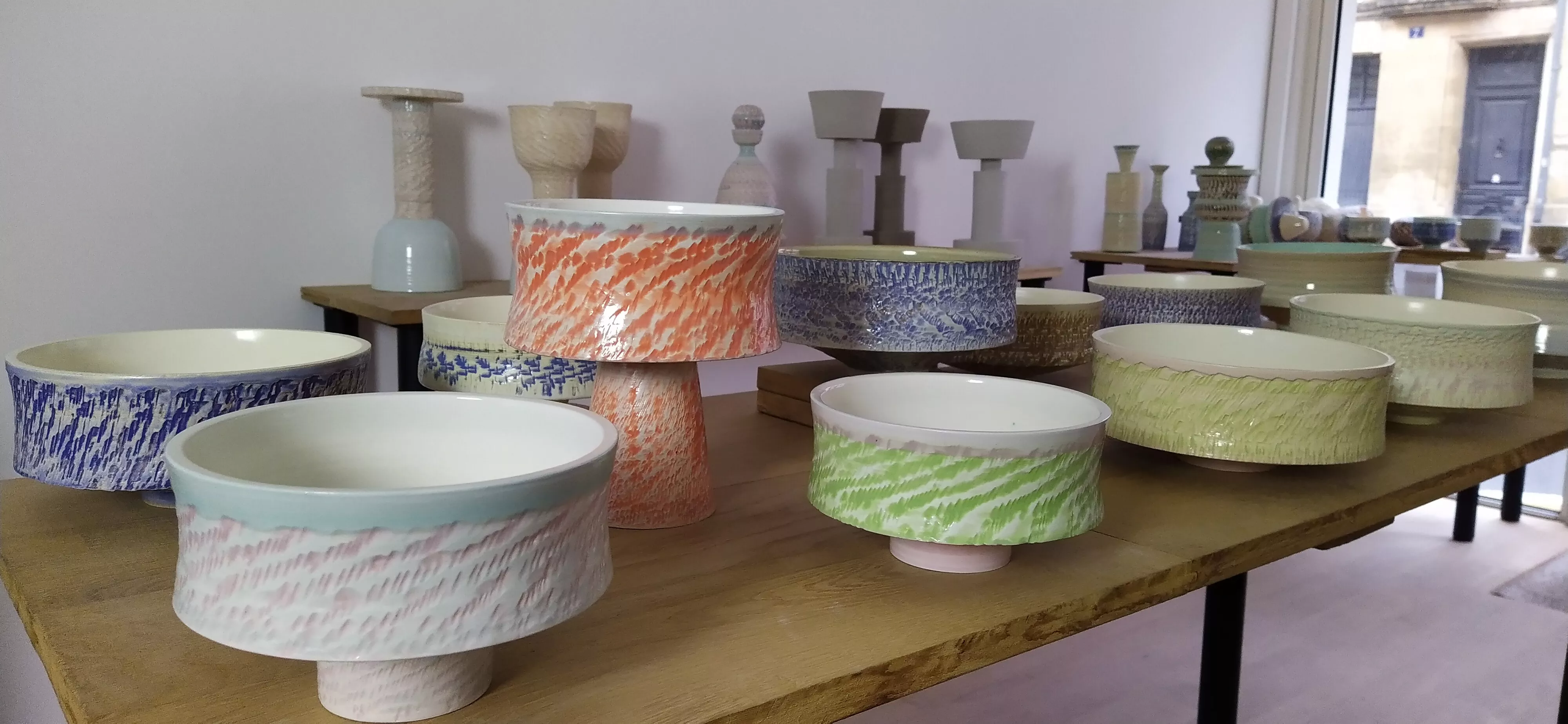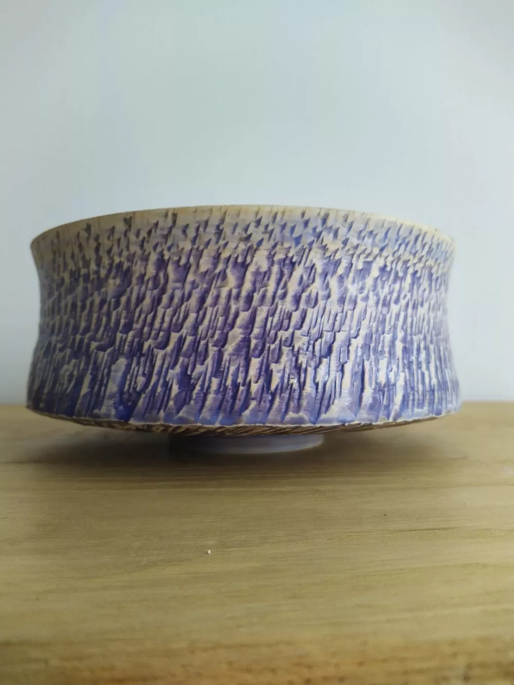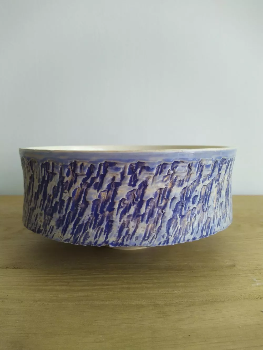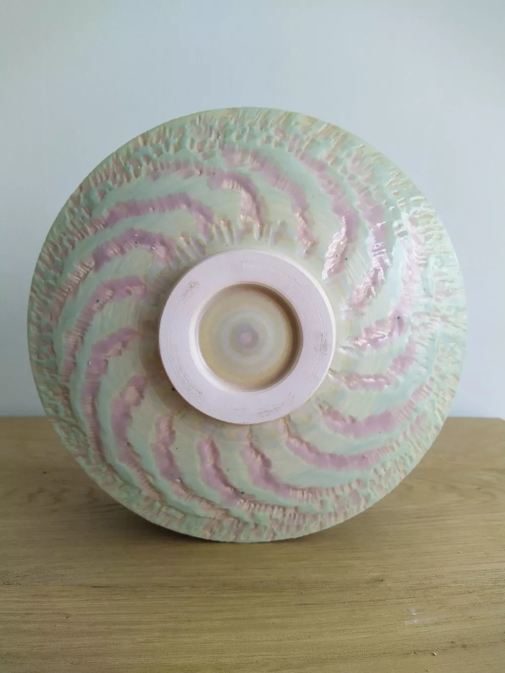 Ces coupes résultent de l’assemblage de deux formes tournées, qui permettent cette ligne de cassure entre le haut et le bas, tout en créant un ensemble harmonieux dans la réunion de ces opposés. Le décor de la partie inférieure dessine, de façon plus évidente encore que pour les bols plus petits, un véritable mandala.
