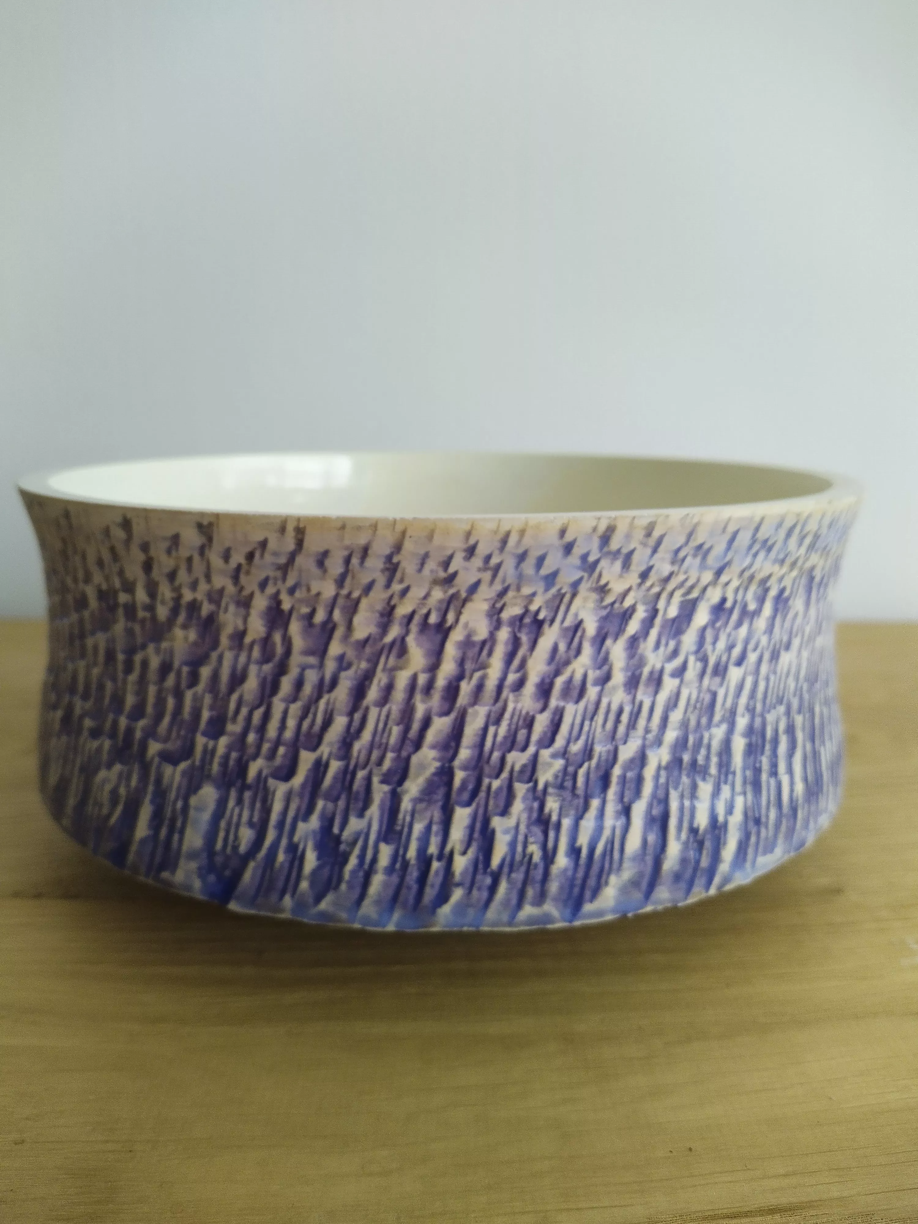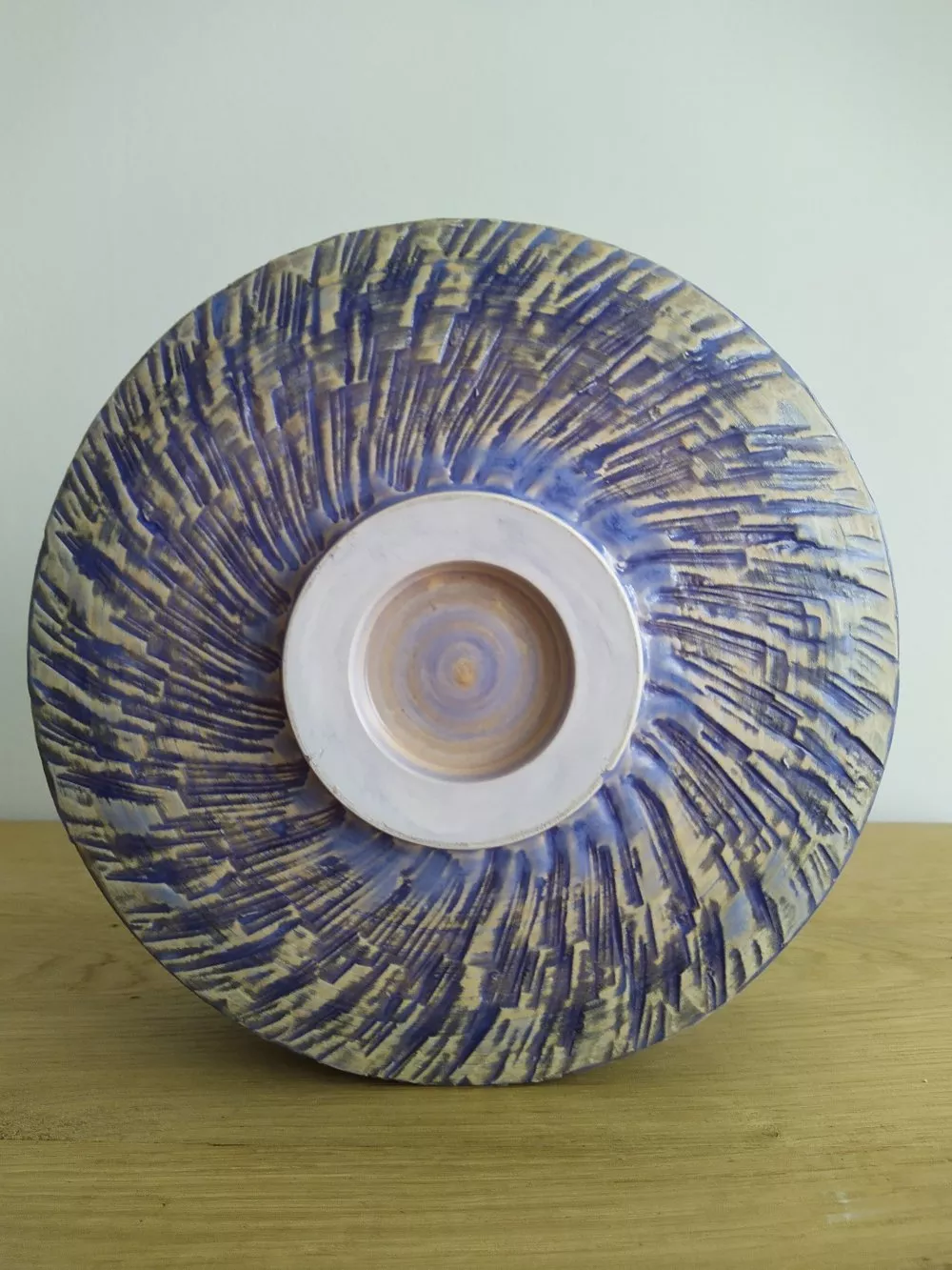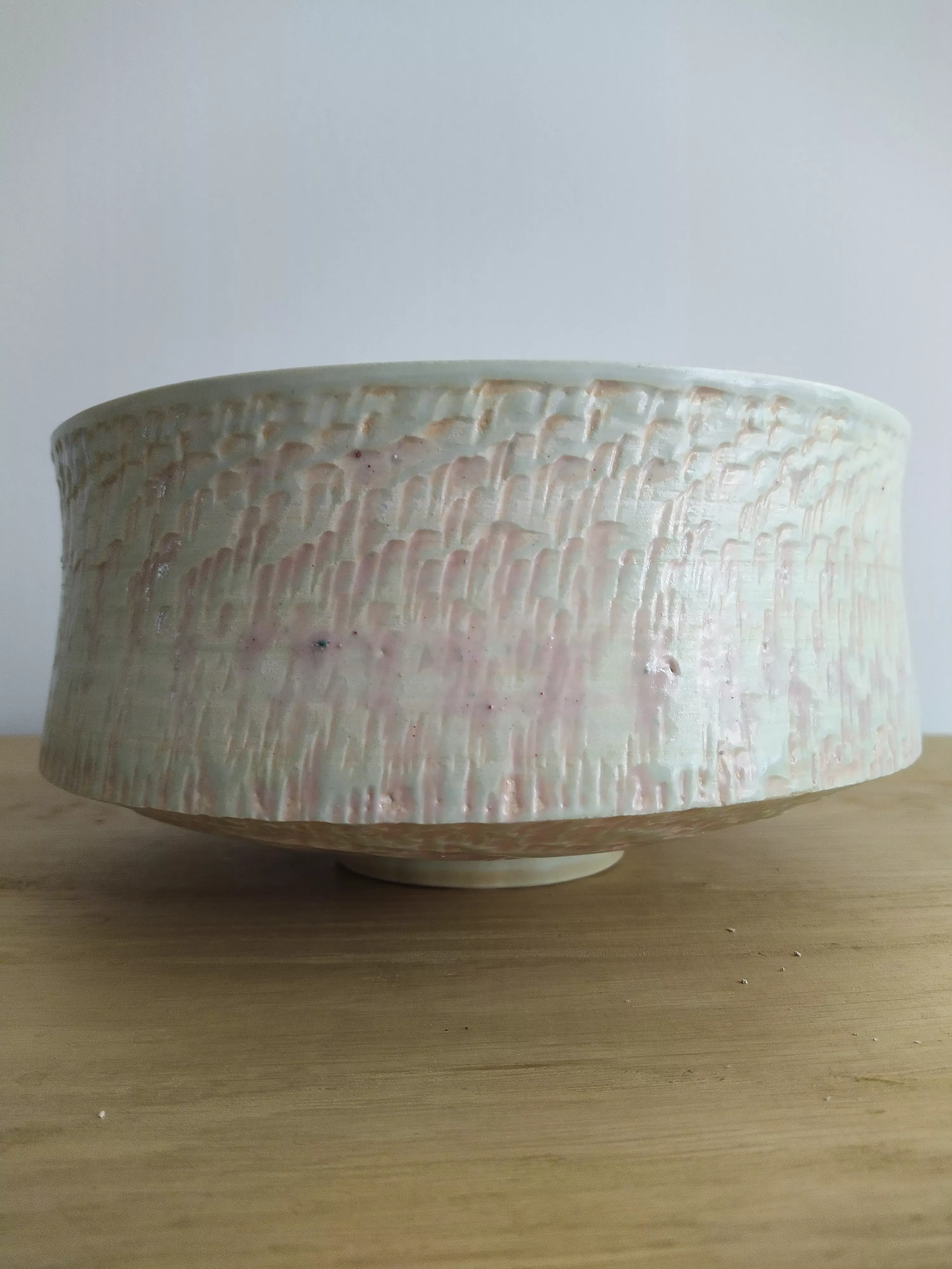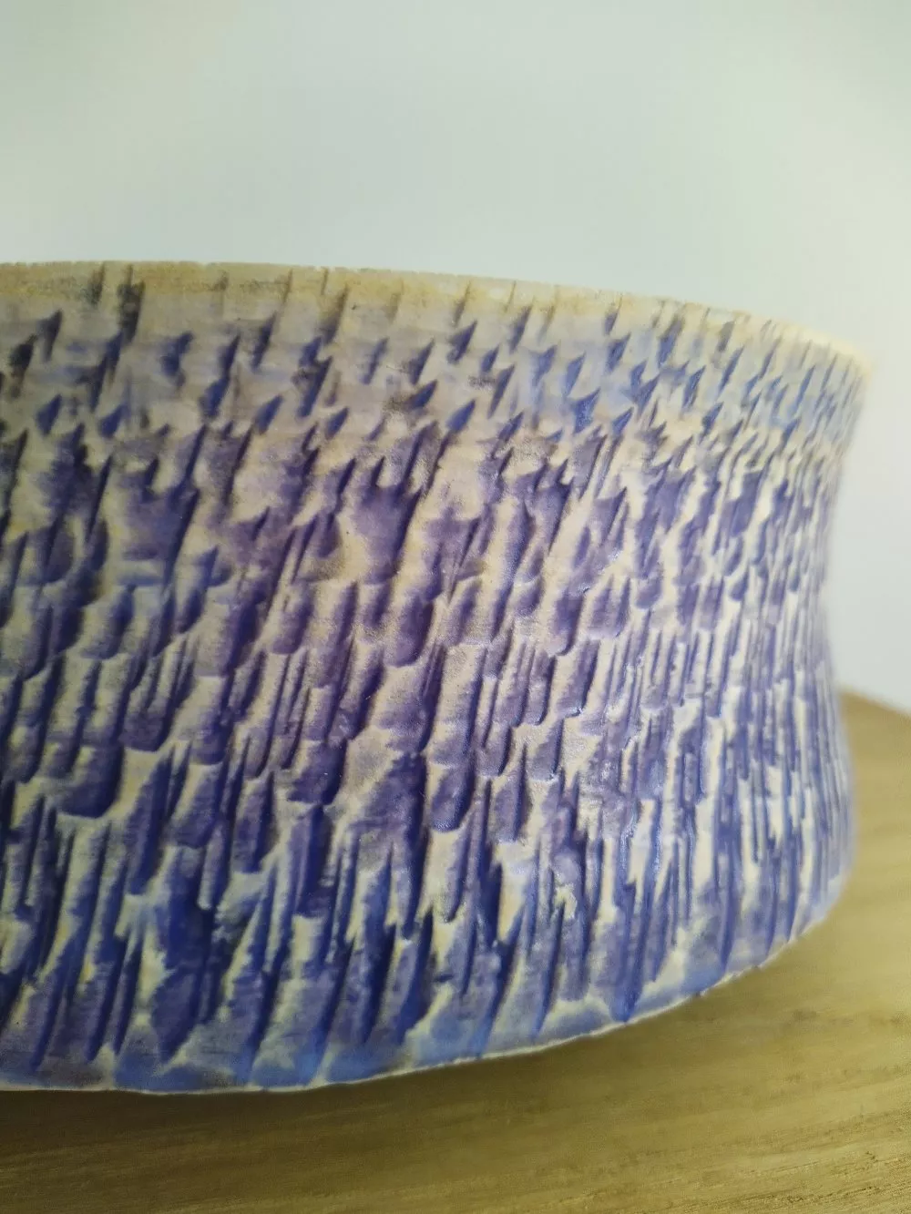 Ces coupes résultent de l’assemblage de deux formes tournées, qui permettent cette ligne de cassure entre le haut et le bas, tout en créant un ensemble harmonieux dans la réunion de ces opposés. Le décor de la partie inférieure dessine, de façon plus évidente encore que pour les bols plus petits, un véritable mandala.
